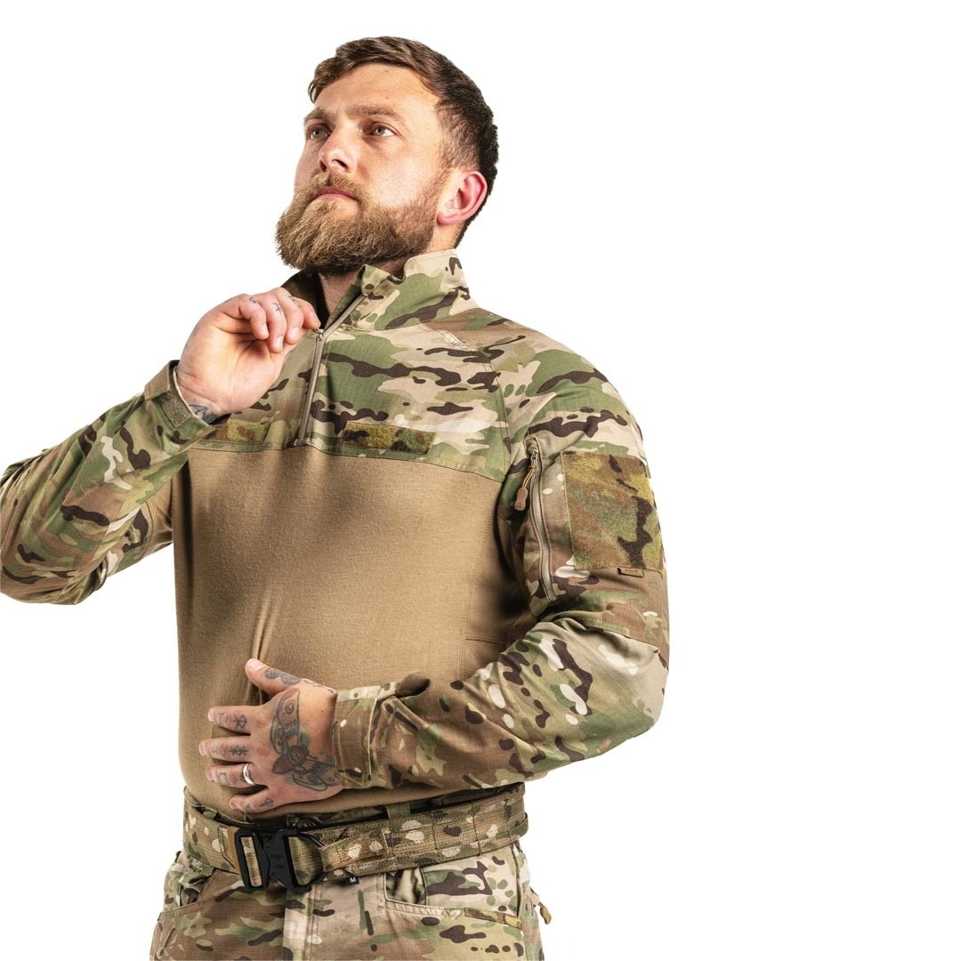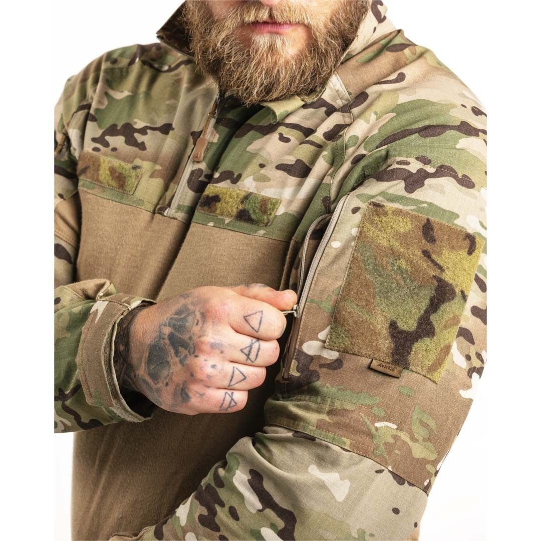 Conçues dans un esprit de mouvement, les manches raglan s’associent aux panneaux ajustés sous les bras pour maintenir la chemise en place pendant l’activité. Des poches administratives zippées sur chaque manche permettent de ranger les vêtements sous le patch d’identification en velcro.