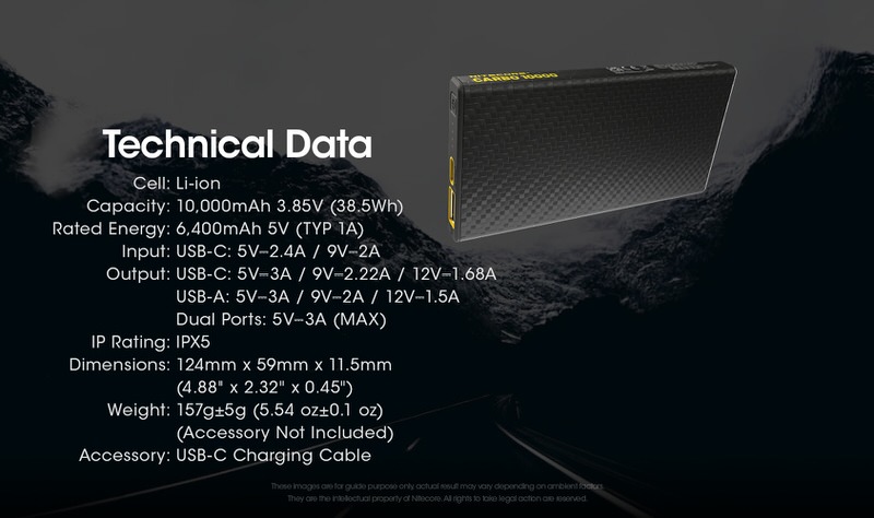 2- 1 Powerbank CARBO 10000 + 1 câble Nitecore UAC20 + 1 chargeur secteur QC3A