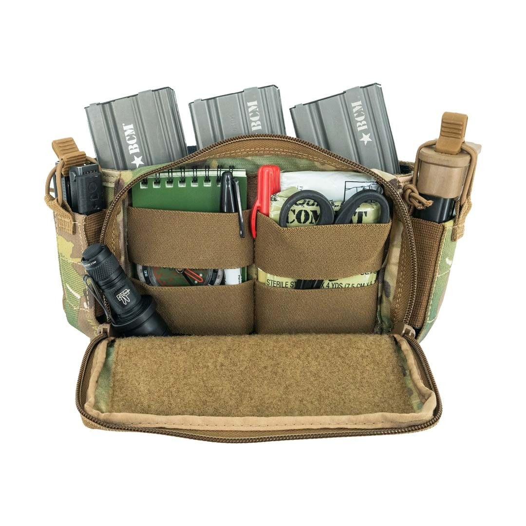 - Le Micro possède 2 poches utilitaires latérales avec des élastiques pour le transport rationalisé de chargeurs de pistolet, de lampes de poche, d’outils utilitaires ou de grenades de 37 mm/40 mm. La pochette avant zippée à usage général comprend un élastique de rétention interne ainsi qu’un panneau complet de boucles VELCRO® pour l’organisation et l’identification visuelle de l’équipement stocké.
