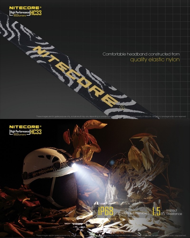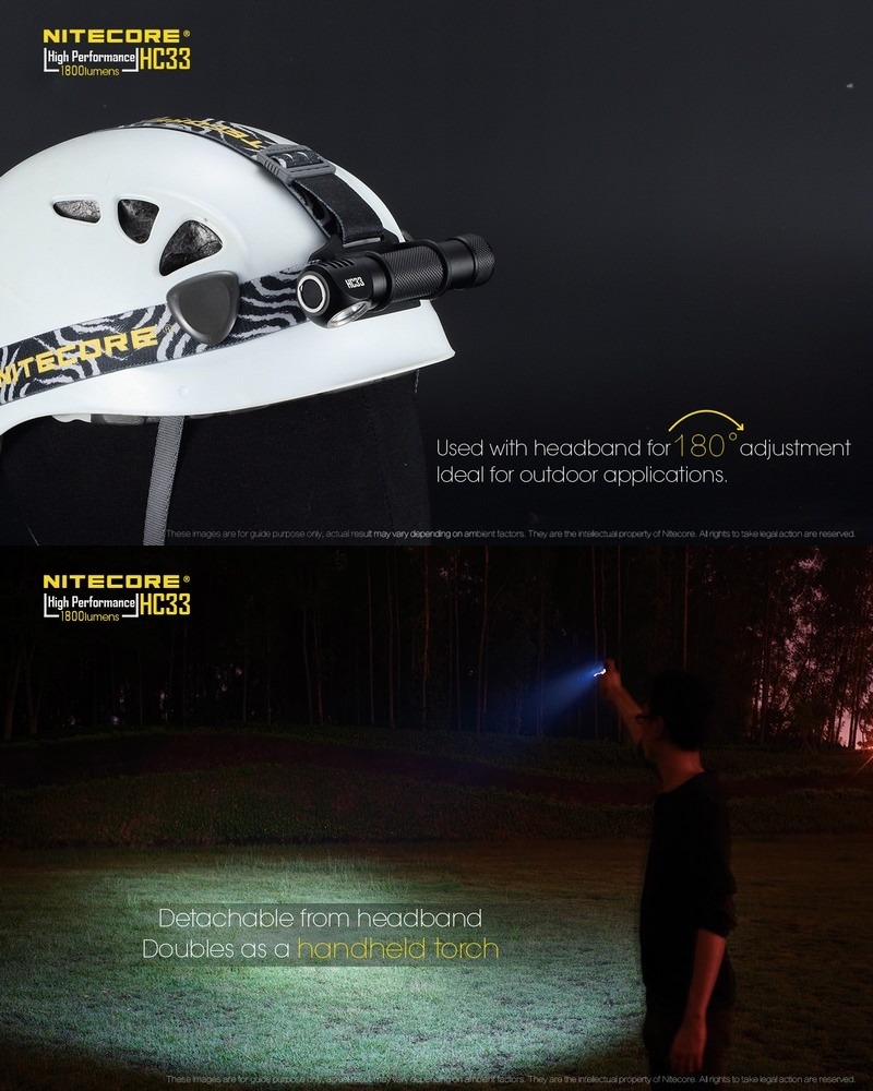 La frontale HC33 peut être alimentée par deux piles CR123A, ou deux batteries RCR123 (16340) ou encore une batterie 18650, attention les 1800 lumens seront atteint si vous l’utilisez avec une batterie Nitecore IMR 18650 3100mAh ou la batterrie NL1835HP, ou une batterie 18650 avec un courant de décharge continu supérieur à 8A.