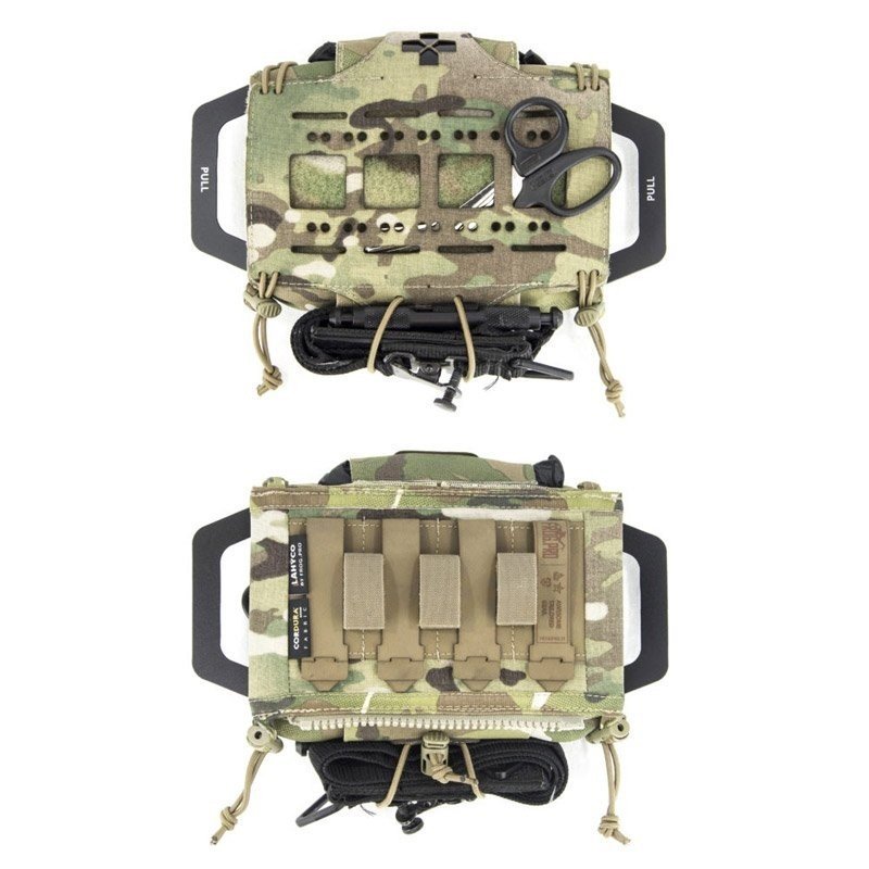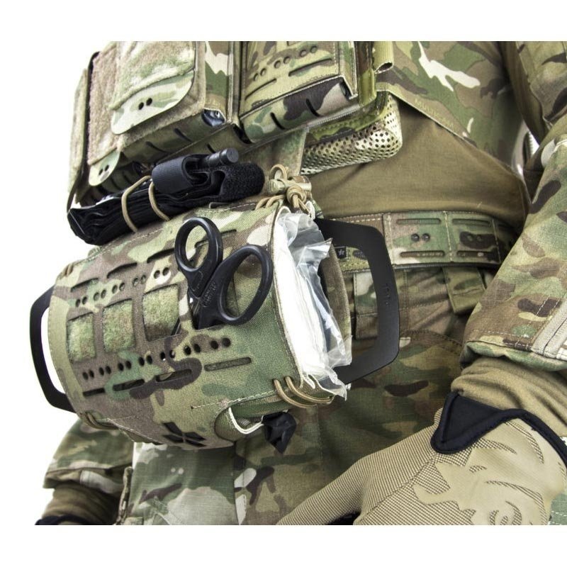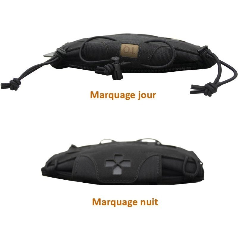 Poche médic modulaire pour kit individuel de première urgence, pour emporter seulement l’essentiel et pouvoir l’utiliser à une main. Elle a été développée pour répondre à une demande des militaires avec des impératifs.