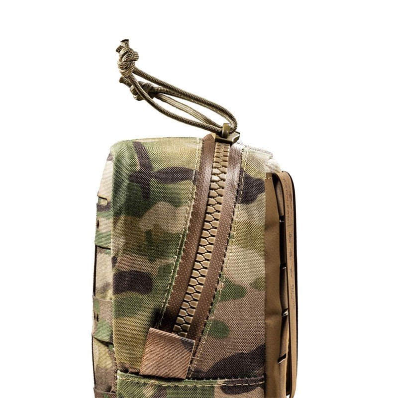 Le corps de la pochette est fabriqué en Cordura® 500D avec un revêtement polyuréthane et une finition DWR (Durable Water Repellent) pour résister à l’eau. La fermeture est confiée à une fermeture à glissière YKK® Aquaguard avec revêtement hydrofuge, cousue selon un design incliné particulier étudié par FROG PRO®, qui permet une vue complète de l’intérieur de la pochette lorsqu’elle est ouverte.