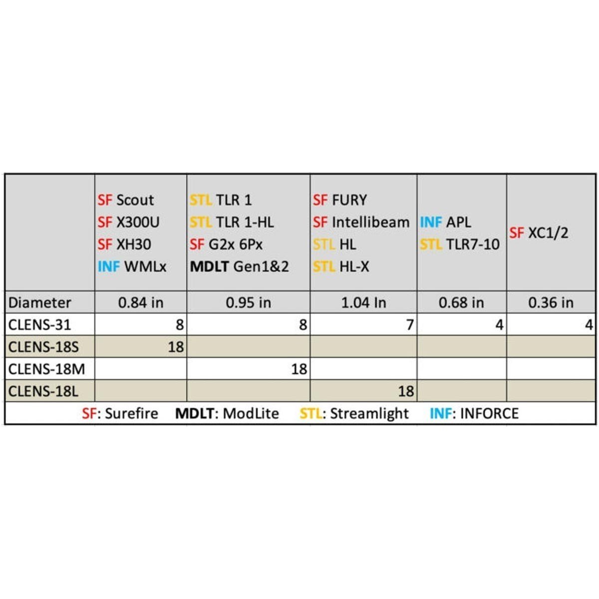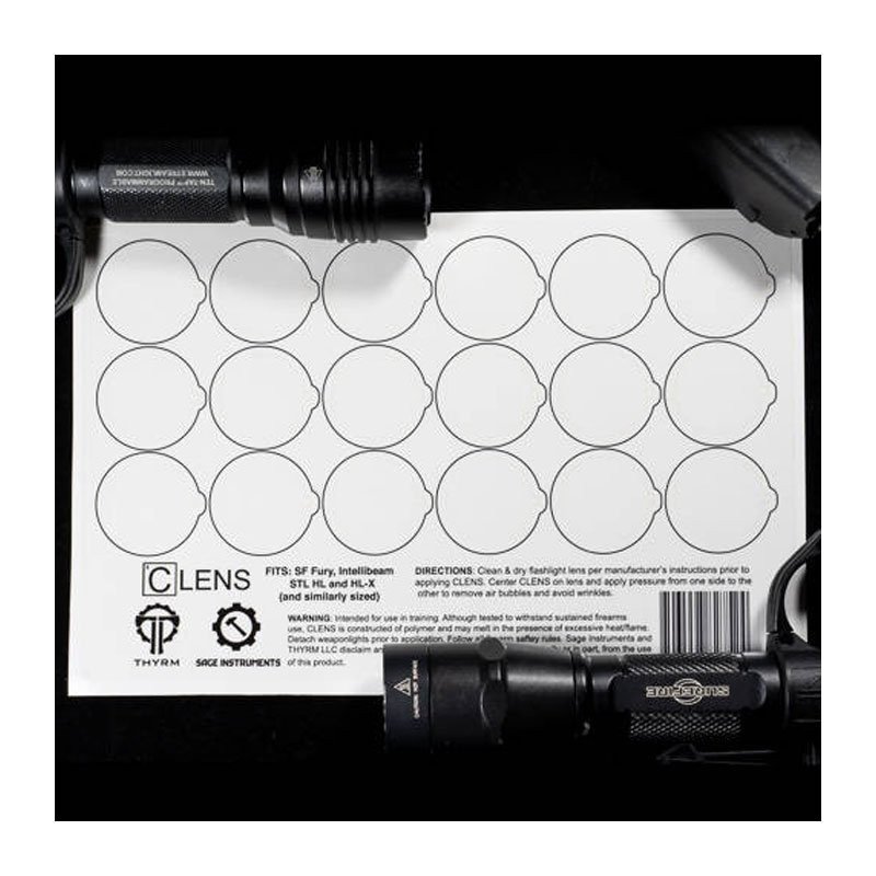 Les lampes ne fonctionnent bien que lorsque leurs lentilles sont propres. La protection CLENS offre un moyen facile de protéger les lentilles pendant les séances de tir prolongées. Tout comme les lunettes de protection pour la conduite hors route, il suffit de retirer le CLENS sale pour redonner à votre lampe sa luminosité optimale. CLENS (prononcer « cleanse ») est un ensemble de cercles en polymère transparent résistant à la chaleur, découpés pour s’adapter à une large gamme de lentilles, de lampes de poche et de lampes d’armes. Chaque CLENS protège la lentille du carbone et des autres débris qui peuvent s’accumuler pendant l’entraînement aux armes à feu. Les CLENS peuvent être retirés pour nettoyer rapidement une lampe, plutôt que de devoir appliquer de la vaseline avant le tir, remplacer une lentille ou risquer l’abrasion avec des nettoyants pour lentilles. Le support adhésif doux de chaque CLENS a une plus grande affinité pour le polymère que pour le verre. Elles se fixent et se positionnent facilement, sans laisser d’adhésif sur le verre propre. Toutefois, l’adhésif peut coller à un verre sale ou endommagé ; dans ce cas, le fait de toucher le côté collant de CLENS à tout adhésif résiduel devrait le retirer du verre.